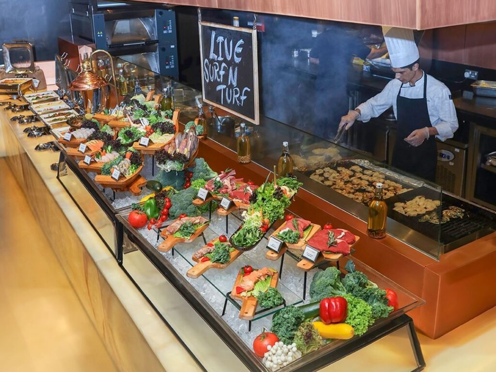 Embark on a culinary journey with our Thursday Surf ‘N Turf dinner buffet. Dive into a delectable spread featuring succulent meats and fresh seafood from live stations, sushi, grills, hot and cold appetizers, and an enticing array of desserts.